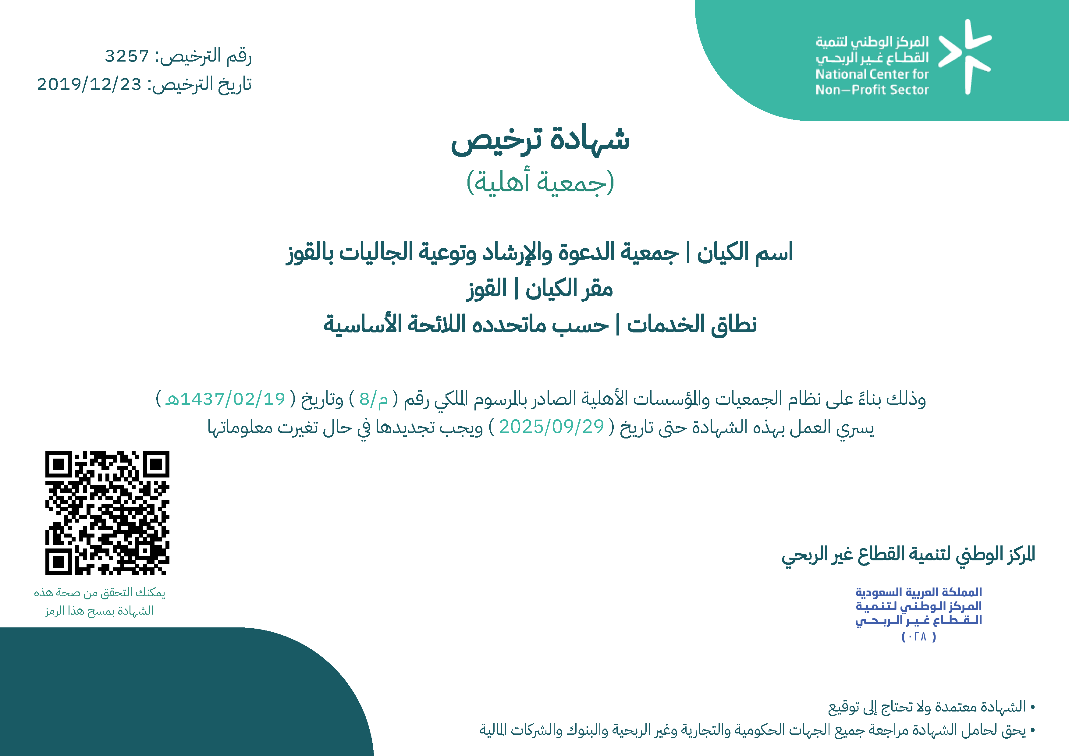 جمعية الدعوة والإرشاد وتوعية الجاليات بالقوز، جمعية دعوية سعودية مسجلة في وزارة الموارد البشرية برقم (3257)، وتاريخ 26/ 4/ 1441هـ تهدف إلى الدعوة إلى الله تعالى بالحكمة والموعظة الحسنة، بتوجيه وإرشاد وتوعية المسملين من المواطنين والمقيمين، وتدعو غير المسلمين إلى الإسلام.
